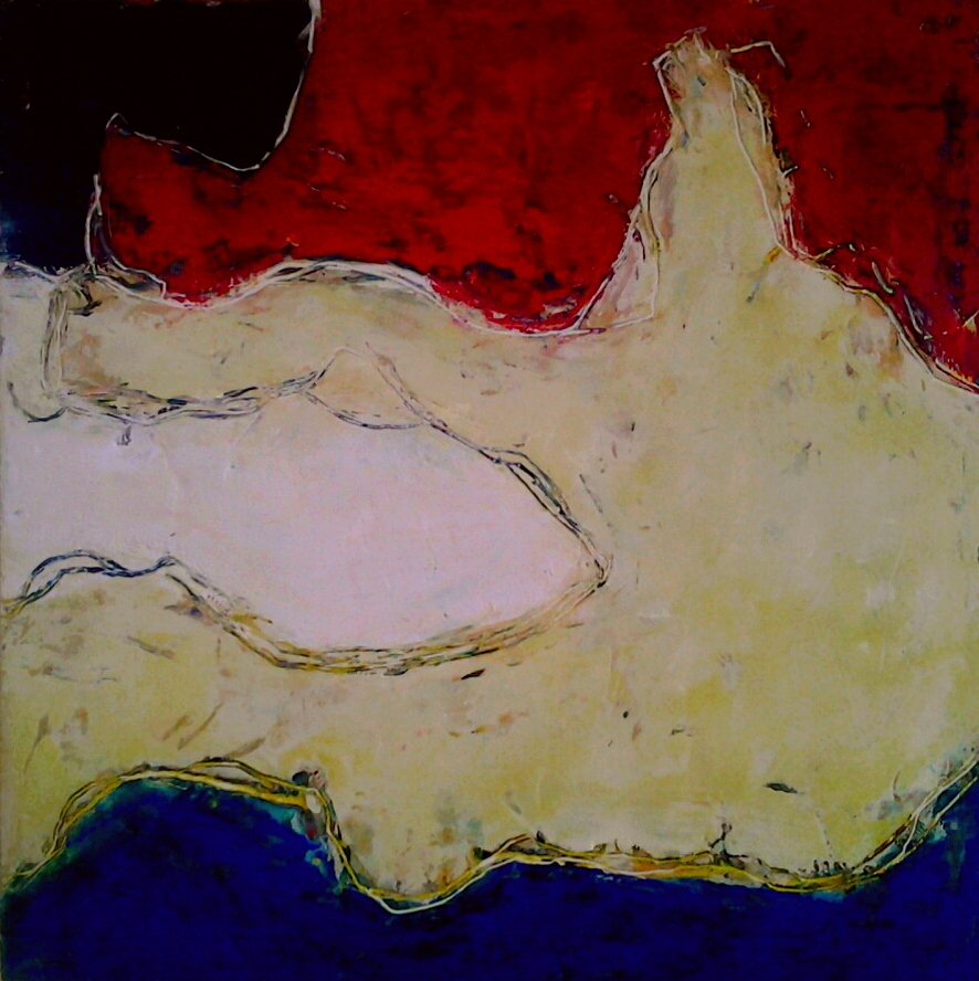 Liz is working on themes to do with land, territory, migration, erosion and the environment. The layers of wax and oil are built up with a roller and palette knife. The layers are drawn on  and scraped through with a knife revealing hidden colours and adding texture. The wiggly lines evoke ancient migration routes and territorial boundary changes. Liz’s inspiration comes from her passion for her rugged home landscape in Donegal, Ireland and her extensive travels, most recently in the Himalayas in Nepal, in Italy and Portugal.
