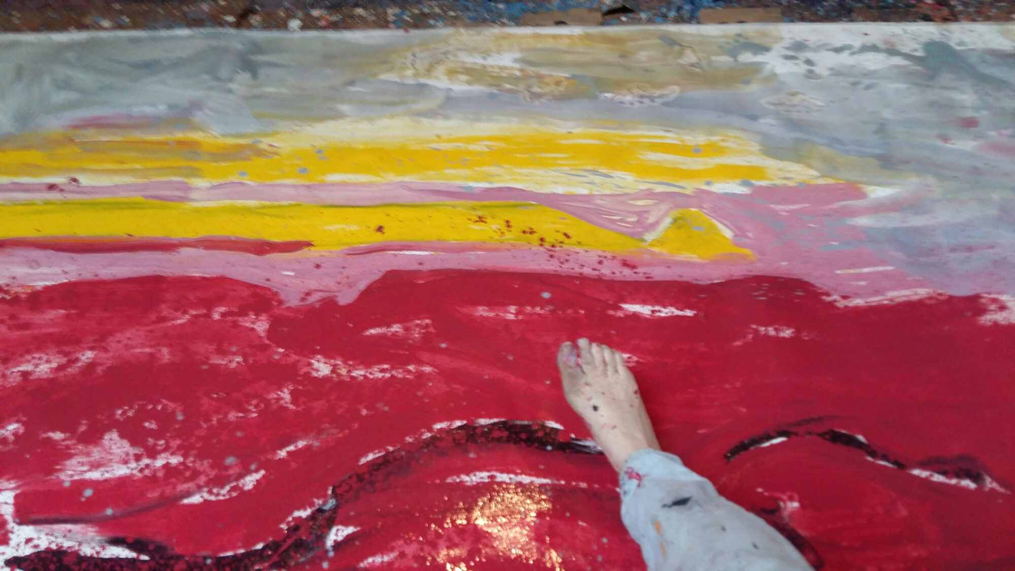 A bold, framed, pink, red and blue abstract on board, ‘ Deeper yet and darker still’60cm sq