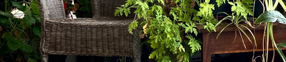 Yellow wall and red geraniums, green growth of many shades and shapes. Who chose the vibrant warm wall colour? A corner of a cane table with text heavy folded paper. A broadsheet. Who reads?