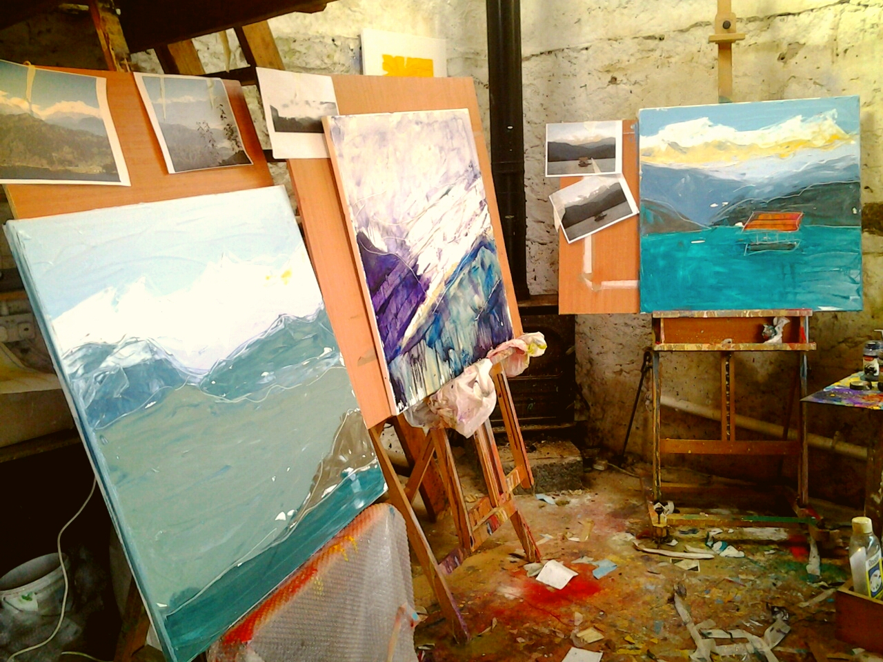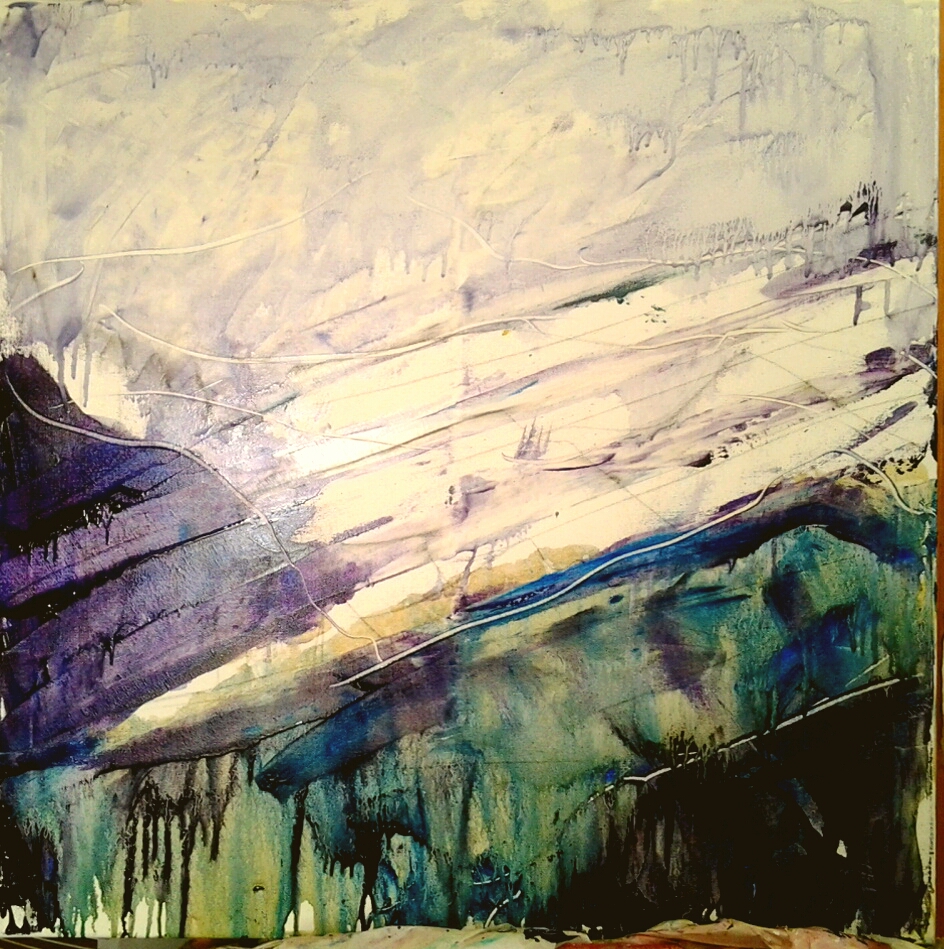 2 Himalayas paintings, both abstracted views from Namobuddha on the rim above Kathmandu valley, have come in to dry in the utility room