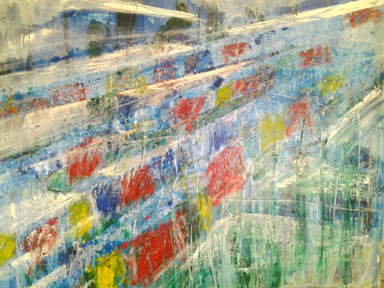 Removed the tape and added some more red, blue and yellow oil bar to bring up the colour again